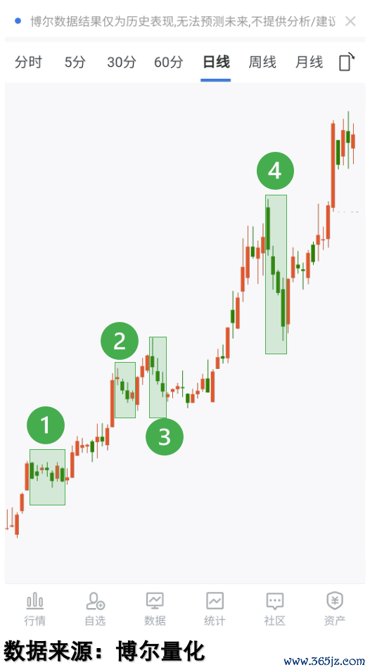 比如下面这只股票,它的走势就非常典型。在区域①到区域③,股价整体是上涨的,但过程极其曲折。涨两天就调整,调整完刚有点起色又开始震荡。好不容易熬过了一段,来到区域④,形态上看起来很像要“做顶”了,这时候很多人会因恐惧而选择离场。但结果呢?你前脚刚走,它后脚就开启了主升浪,涨到让人后悔莫及。