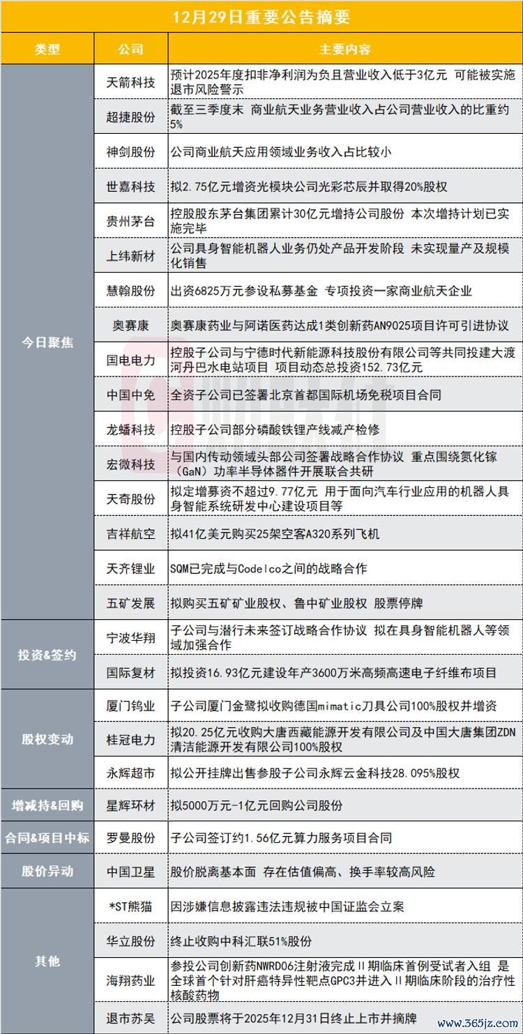 12月29日晚间光大e配,多家上市公司发布了重要公告。其中,天箭科技公告称,因军品价格调整,预计将调减当期营业收入约2.56亿元,影响净利润约-2.09亿元。公司预计2025年度扣非净利润为负且扣除后营业收入低于3亿元,股票交易可能被实施退市风险警示。另一边,贵州茅台公告,控股股东茅台集团已完成增持计划,累计增持金额达30亿元。